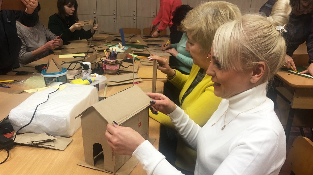 “Олена майстриня на всі руки, вона в нашій школі проживає давно, ще з березня. Вона проявила себе у реалізації багатьох цікавих ідей, проєктів. А тут, напередодні Нового Року, Олена подарувала колективу різдвяний будиночок, цей витвір мистецтва, його інакше не назвеш. І подивившись на цю річ, виникла така ідея: захотіли всі, хто заходив до мене в кабінет, навчитися цієї техніки та як це виготовляти”, — розповіла директора школи.
