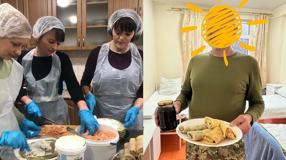 Волонтерка Наталія Шпаковська розповіла: “Трохи модифікували звичайний рецепт млинців: вони популярні, апетитні, корисні. Корисні, тим що в тісто в нас входить шпинат, який є джерелом клітковини, а також мінералів, а в начинку ми додаємо вершковий сир і червону рибу, яка дасть нам ненасичені жирні кислоти. Вони дуже корисні для наших поранених, щоб вони скоріше одужували. Тобто це така вітамінна бомба, у вигляді млинця”.