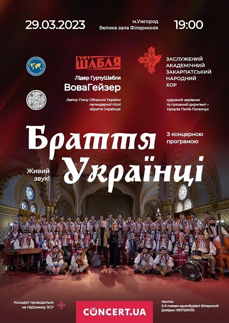 Перший концерт Заслуженого академічного Закарпатського народного хору та рок-гурту «Шабля» відбудеться 29 березня о 19:00 у великій залі філармонії.