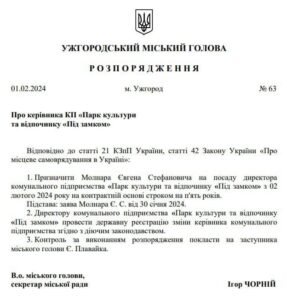 Як йдеться у розпорядженні в.о. Ужгородського міського голови від 1 лютого, контракт із Євгеном Молнаром підписано терміном на п’ять років.