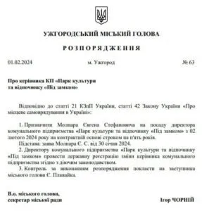 Як йдеться у розпорядженні в.о. Ужгородського міського голови від 1 лютого, контракт із Євгеном Молнаром підписано терміном на п’ять років.