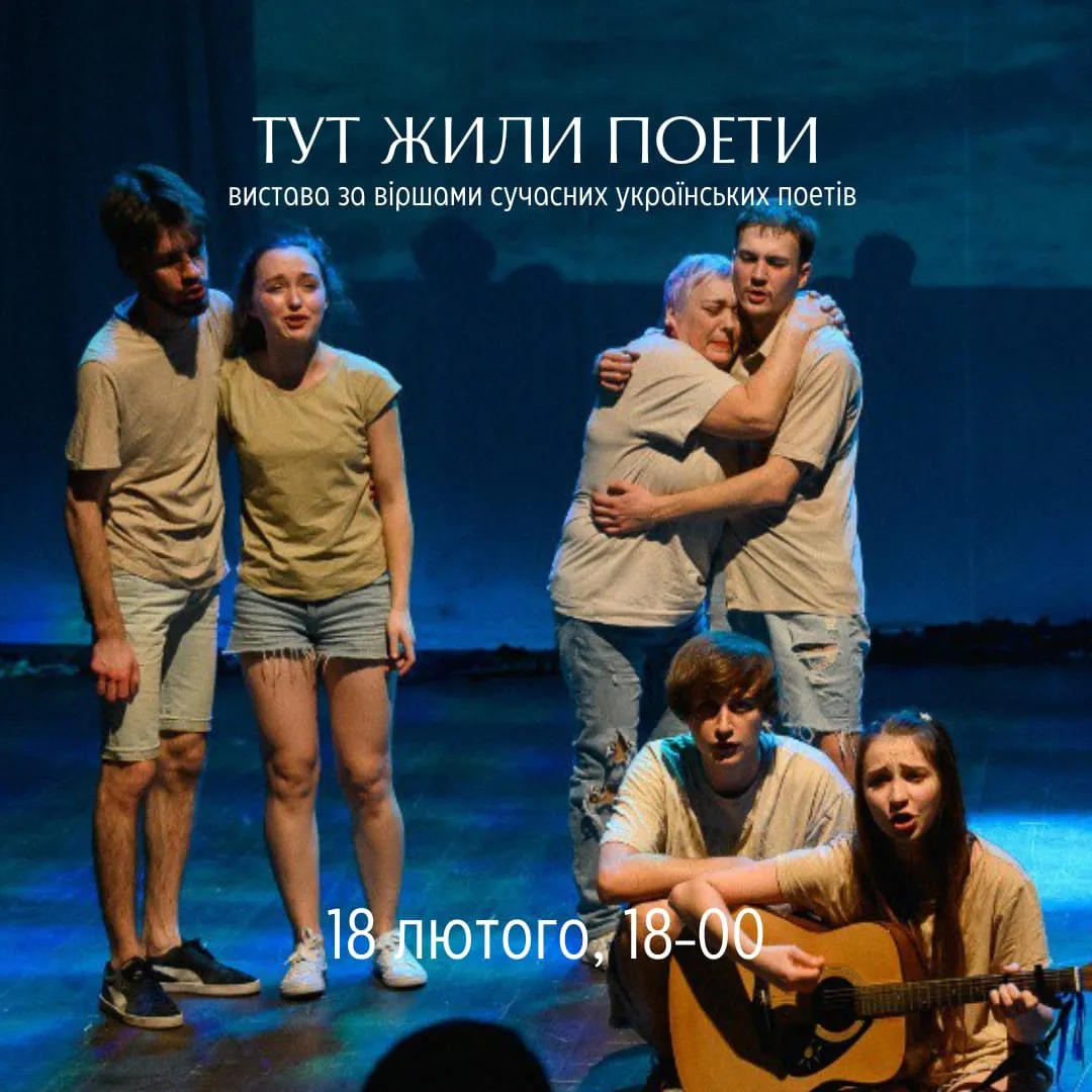 18 лютого о 18-00 (Мала Сцена) – прем’єра «Тут жили поети» за віршами сучасних українських поетів. Режисерка, художниця, музичне оформлення – заслужена артистка України Людмила Колосович, пластичне вирішення – Наталія Каспшишак. Музично-пластична вистава