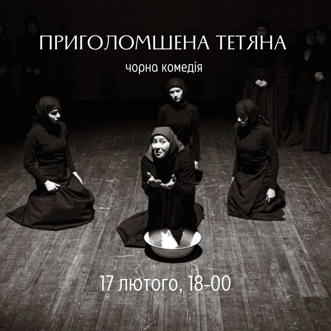 17 лютого о 18-00 – «Приголомшена Тетяна» за п’єсами Л. Бугадзе (Грузія). Режисерка, художниця, музичне оформлення – заслужена артистка України Людмила Колосович, пластичне вирішення – Наталія Каспшишак. Чорна комедія