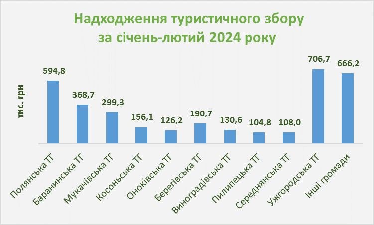Протягом січня-лютого 2024 року до місцевих бюджетів Закарпатської області надійшло 3 млн 452 тис. 100 грн туристичного збору, що на 2,5% менше аналогічного періоду 2023 року.
