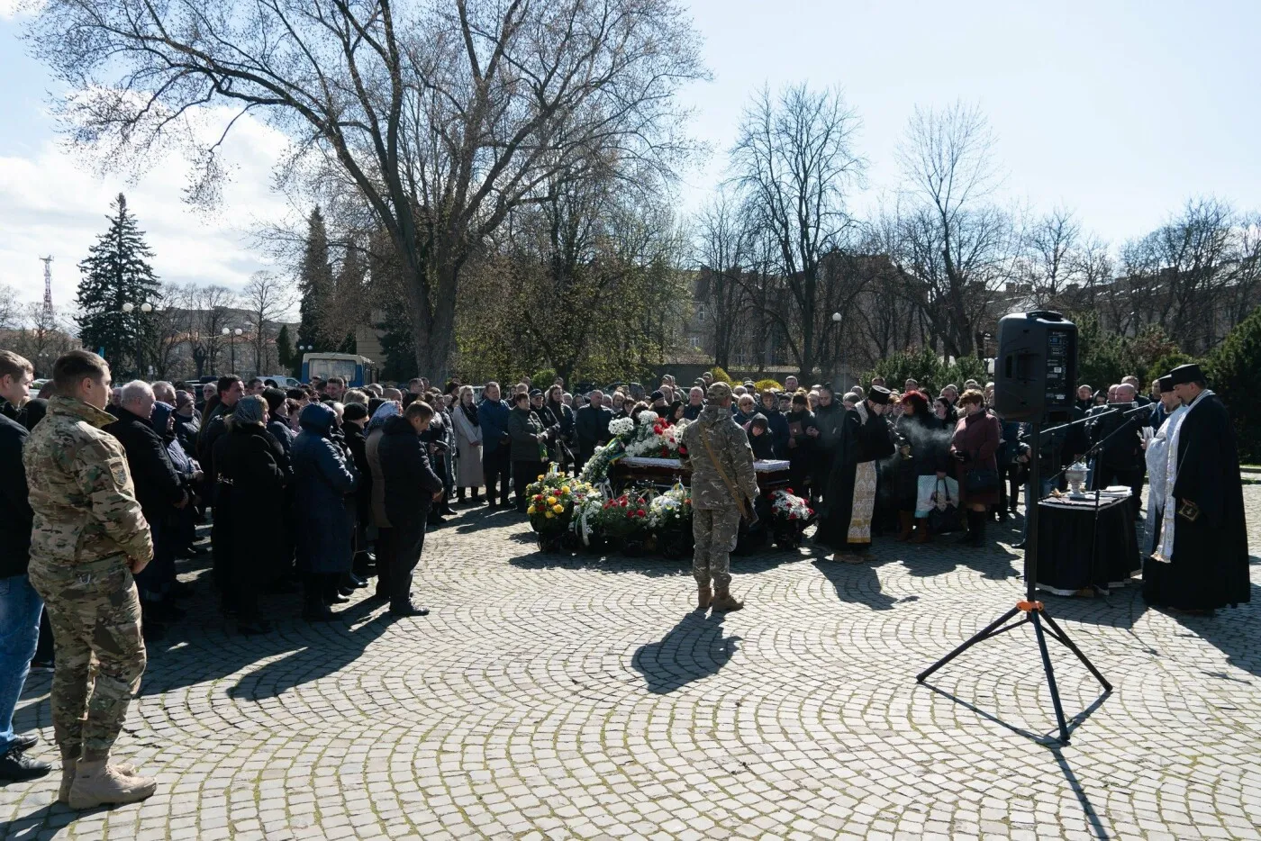 Чин похорону відбувся на площі Народній. Віддати шану захиснику прийшли рідні, близькі, друзі, колеги, міський голова Богдан Андріїв, його заступник Вадим Борець, керівник КП «УККП» Анатолій Сухолов, військові, містяни.