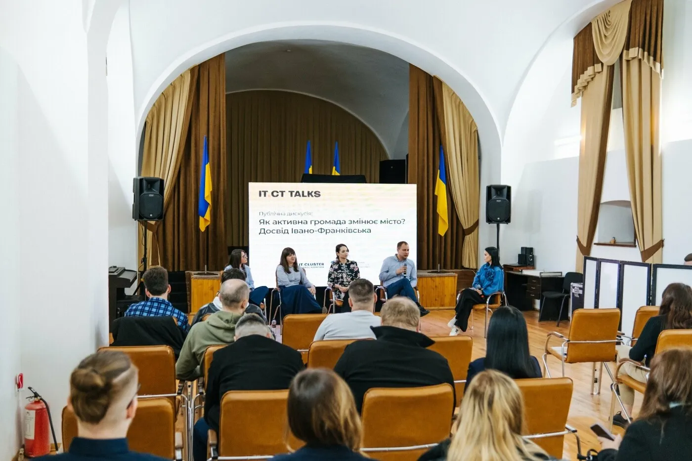 До дискусії долучилися керівниця платформи «Тепле місто» і співзасновниця видання Varosh Росана Тужанська, виконавча директорка Івано-Франківського ІТ-кластеру Ірина Дарвай, виконавча директорка ІТ-кластеру Закарпаття Мирослава Майдич, заступник міського голови Ужгорода Іван Завидняк.