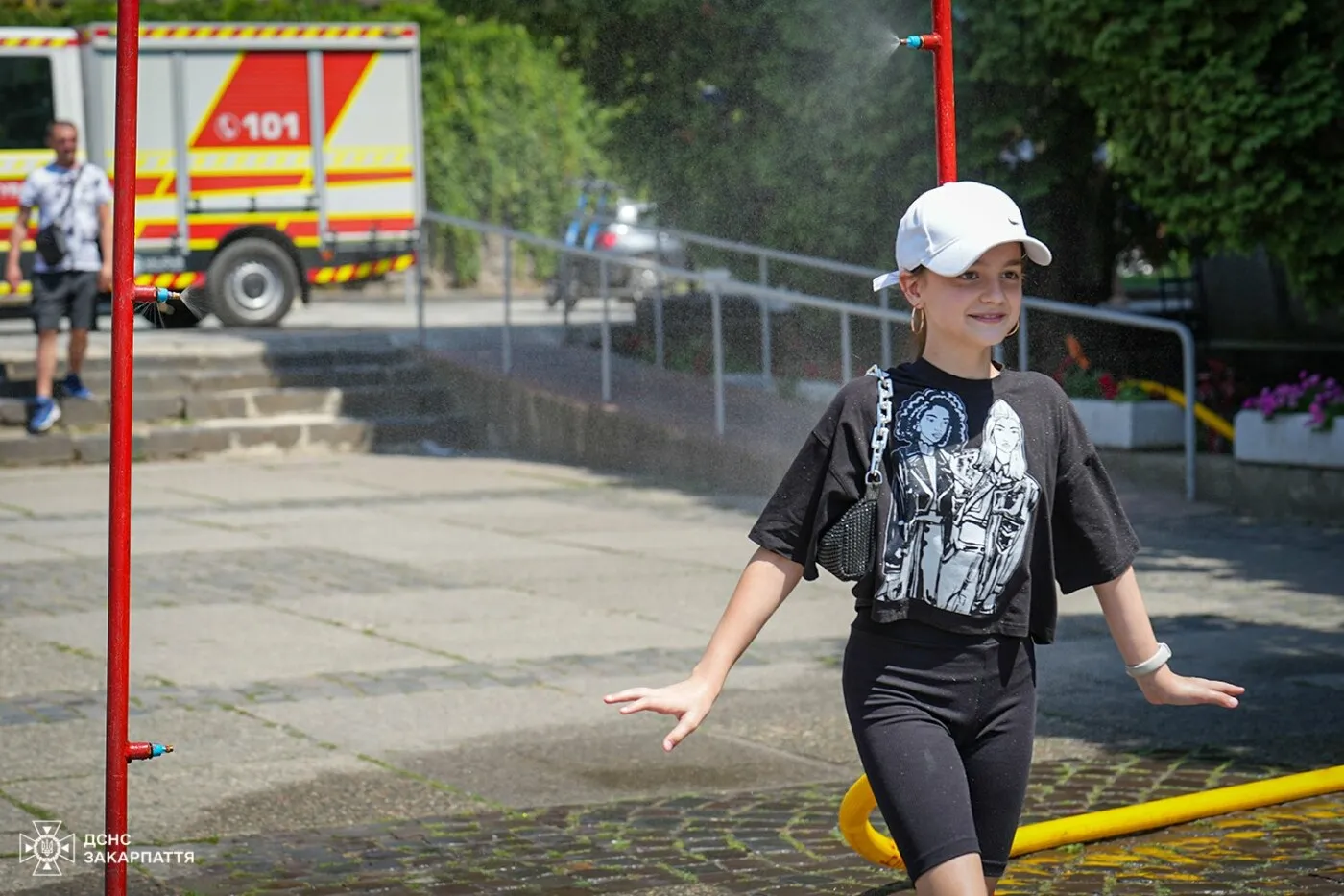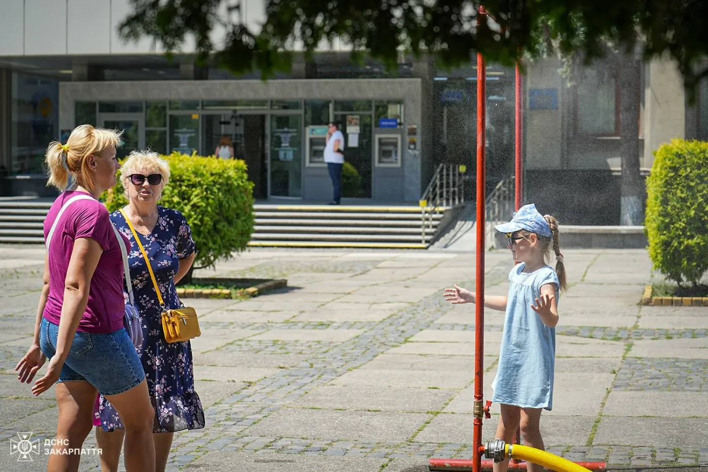 В Ужгороді, де температура перевищила +30 градусів, надзвичайники за ініціативою міськради встановили водяну рамку-розпилювач. Це дозволить мешканцям і гостям міста освіжитися на Поштовій площі.