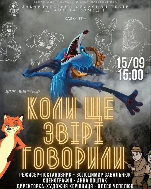 15 вересня о 15:00 Закарпатський обласний театр драми та комедії (м. Хуст) представить своїм глядачам інтерактивну виставу-казку «Коли ще звірі говорили» за мотивами творів Івана Франка.