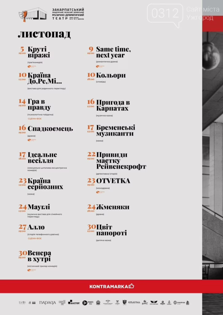 Закарпатський академічний обласний український музично-драматичний театр імені братів Шерегіїв представив репертуар на листопад.