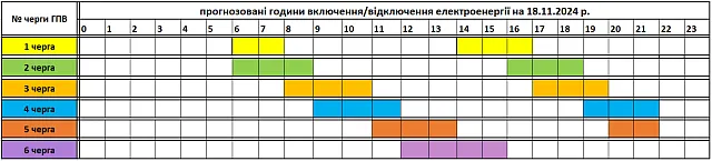 До уваги споживачів графік погодинних включень/відключень електроенергії на 18.11.2024.