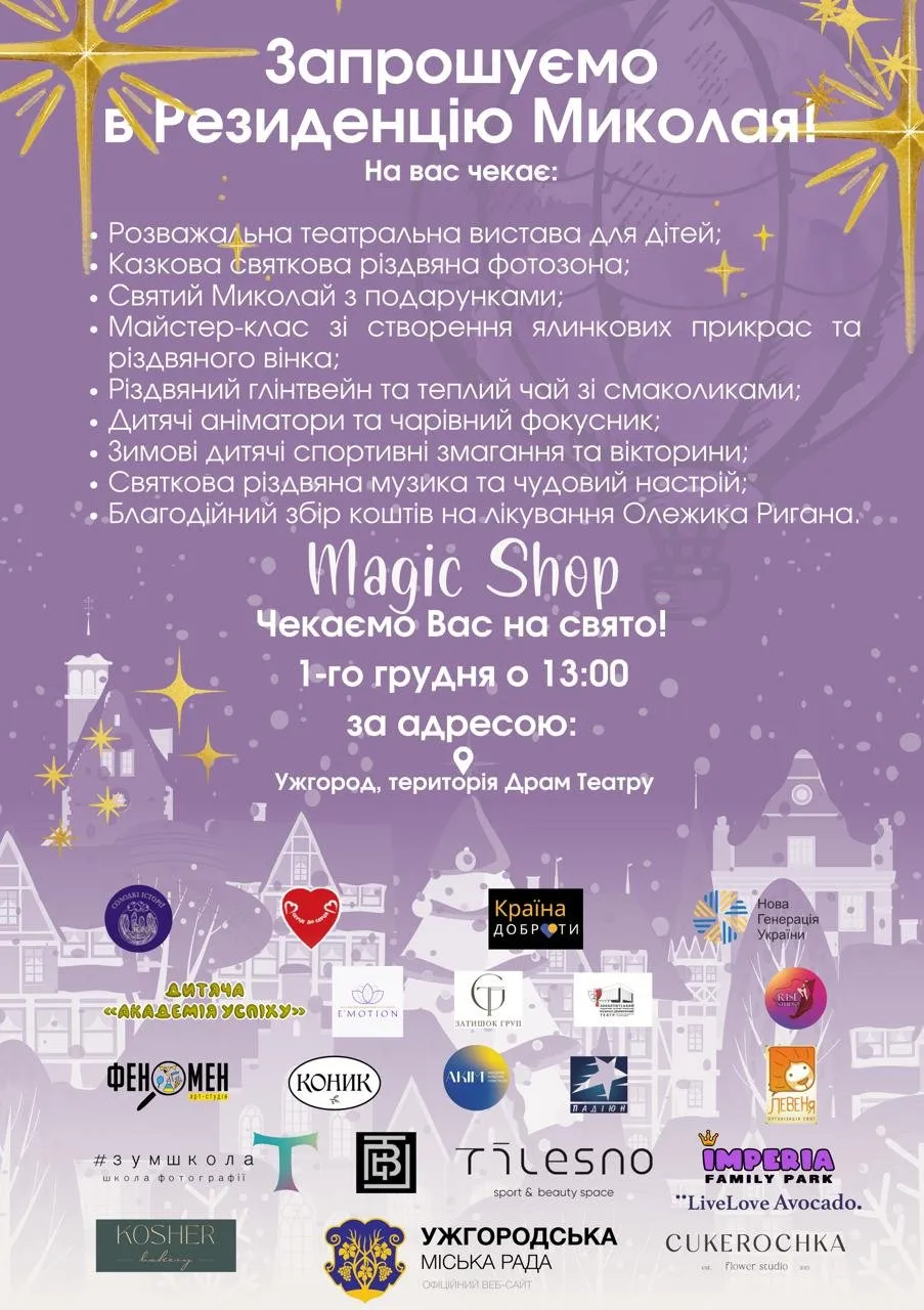 “Справжня зимова казка для ваших дітей та вас у центрі міста! На вас чекає: Зустріч із Миколаєм та подарунки від партнерів. Новорічні фотозони та аніматори. Смаколики та гарячі напої. Розваги та унікальні майстер-класи для дітей. Святкова атмосфера з виступами і сюрпризами.” – повідомляють організатори