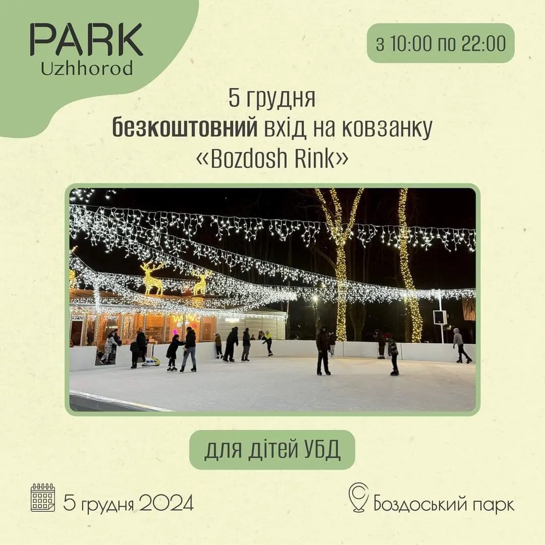 “5 грудня, до Дня святого Миколая, діти, один із батьків яких є учасником бойових дій (УБД) матимуть можливість безкоштовно відвідати ковзанку «Bozdosh Rink».” — йдеться у повідомленні