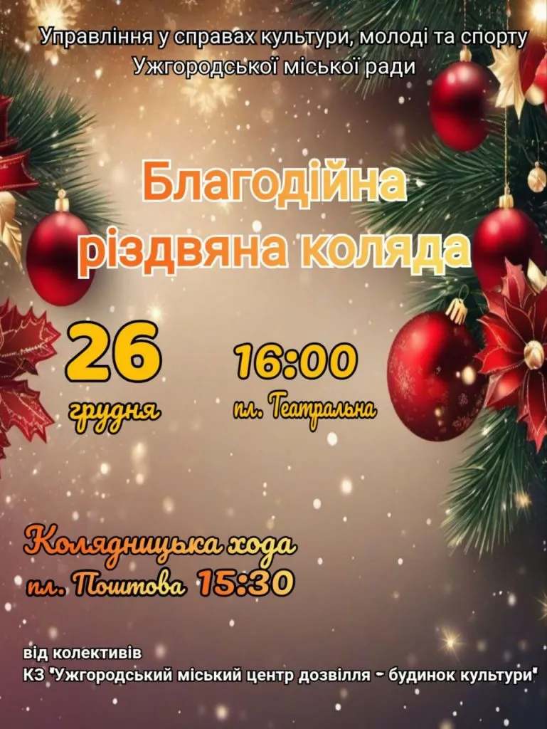 Анонси 24.12.2024, 17:39 👁 15В Ужгороді відбудеться Різдвяна колядницька хода: містян та гостей міста запрошують долучатися Ужгородська міськрада запрошує долучитися до Різдвяної колядницької ходи та спільно створювати святковий настрій із творчими колективами Ужгорода! 26 грудня, четвер Старт ходи – 15:30 із площі Поштової Початок коляди – 16:00. пл. ТеатральнаВас може зацікавити:Унікальна акція «Дитячий письменник за прилавком» стартує в УжгородіПам’ять, що не зникає: у Закарпатському обласному краєзнавчому музеї імені Тиводара Легоцького відкриють виставку-реквіємВ Ужгороді презентують акварелі та архітектурні проєкти видатних митцівПоділитися: Facebook Telegram Viber
