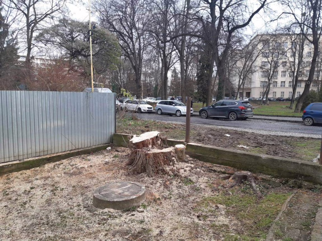 На ділянці вже почали зрубувати здорові дерева. Мешканці цих будинків звернулися по допомогу до депутата міської ради, юриста та нині військовослужбовця Олександра Волосянського з проханням захистити їхній двір.