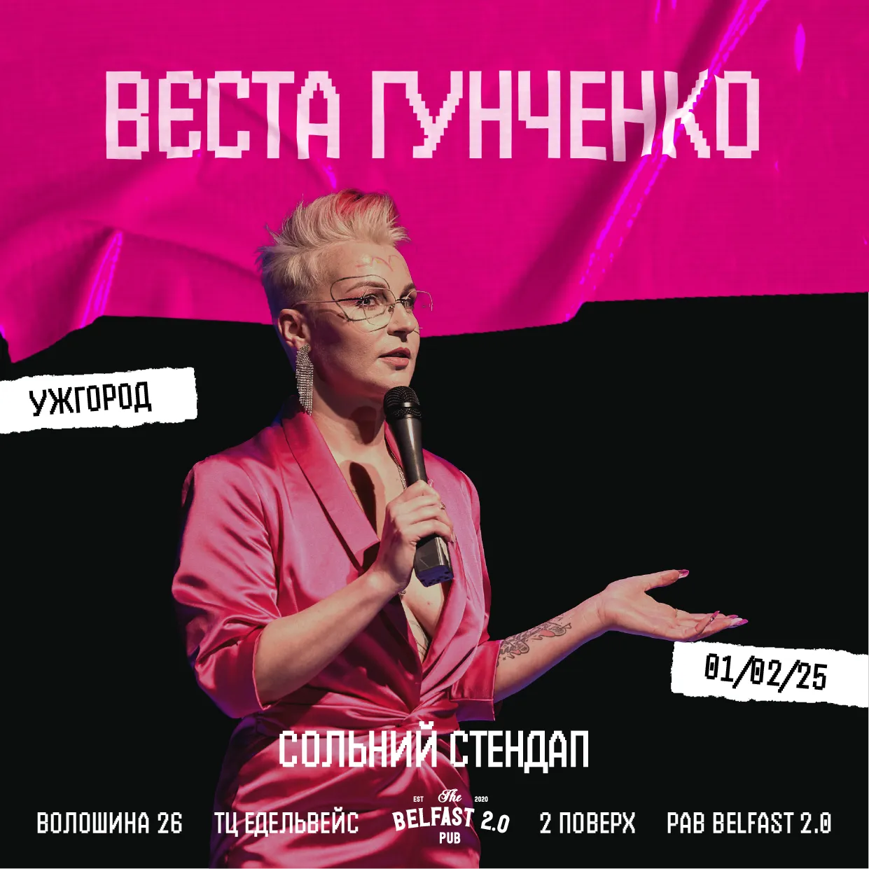 Дотепний і гострий стендап Вєсти Гунченко вже більше чотирьох років розважає глядачів в Україні та Європі. І нарешті комікеса доїхала до Ужгорода, щоб тут також поговорити з глядачами про цікаві кожному теми: стосунки, стереотипи, вік та як насмоктати на інфініті.