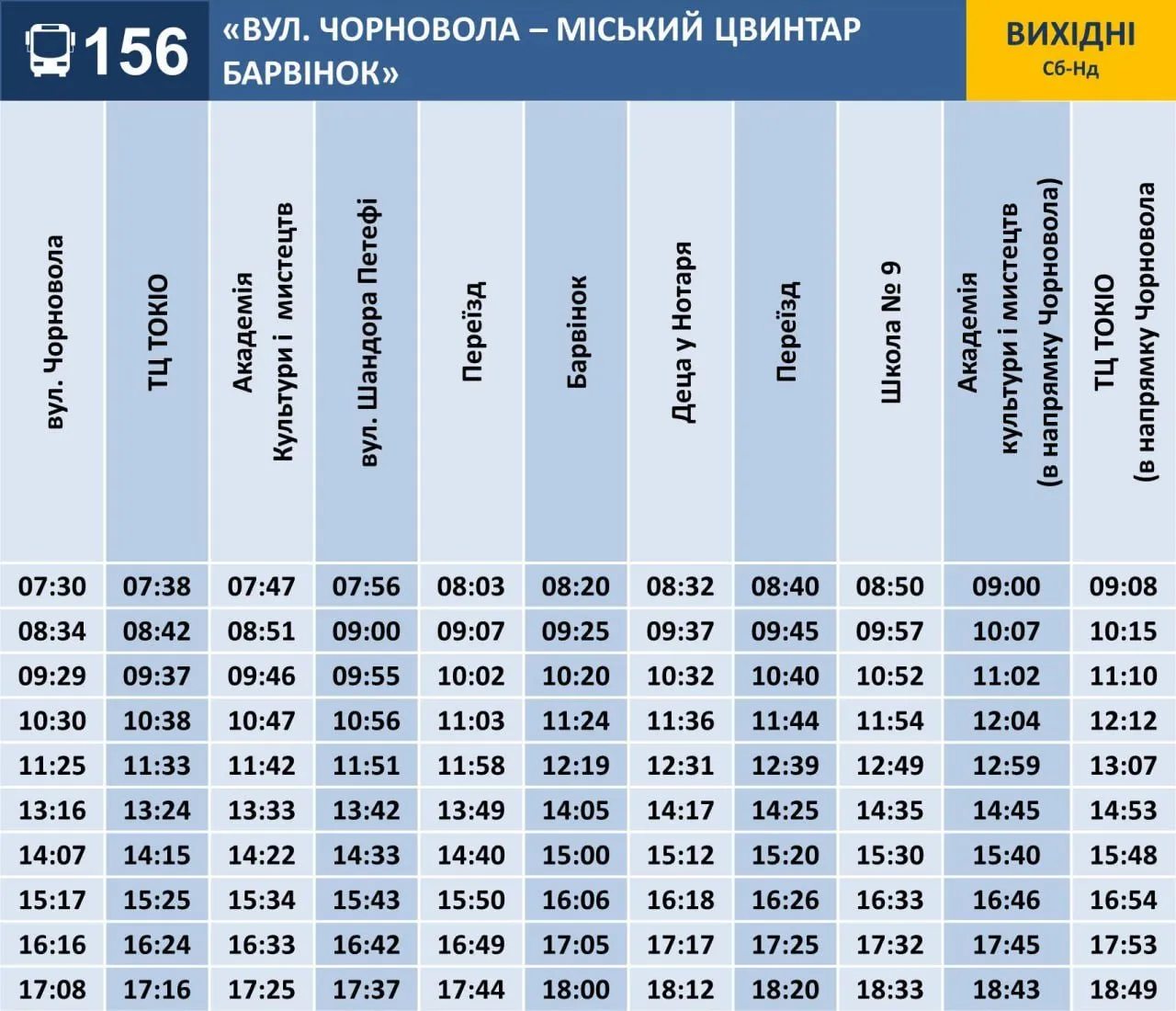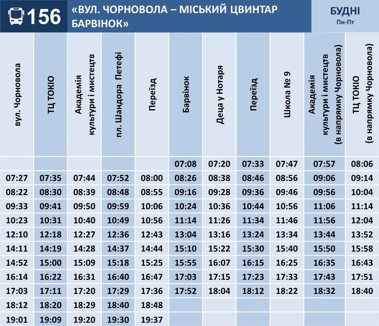 Відзавтра, 4 лютого, на маршруті № 156 «вул. В’ячеслава Чорновола – міський цвинтар «Барвінок» змінюється розклад руху (збільшується кількість рейсів, зменшується інтервал між рейсами) – перевезення пасажирів буде здійснюватися двома автобусами «Електрон».