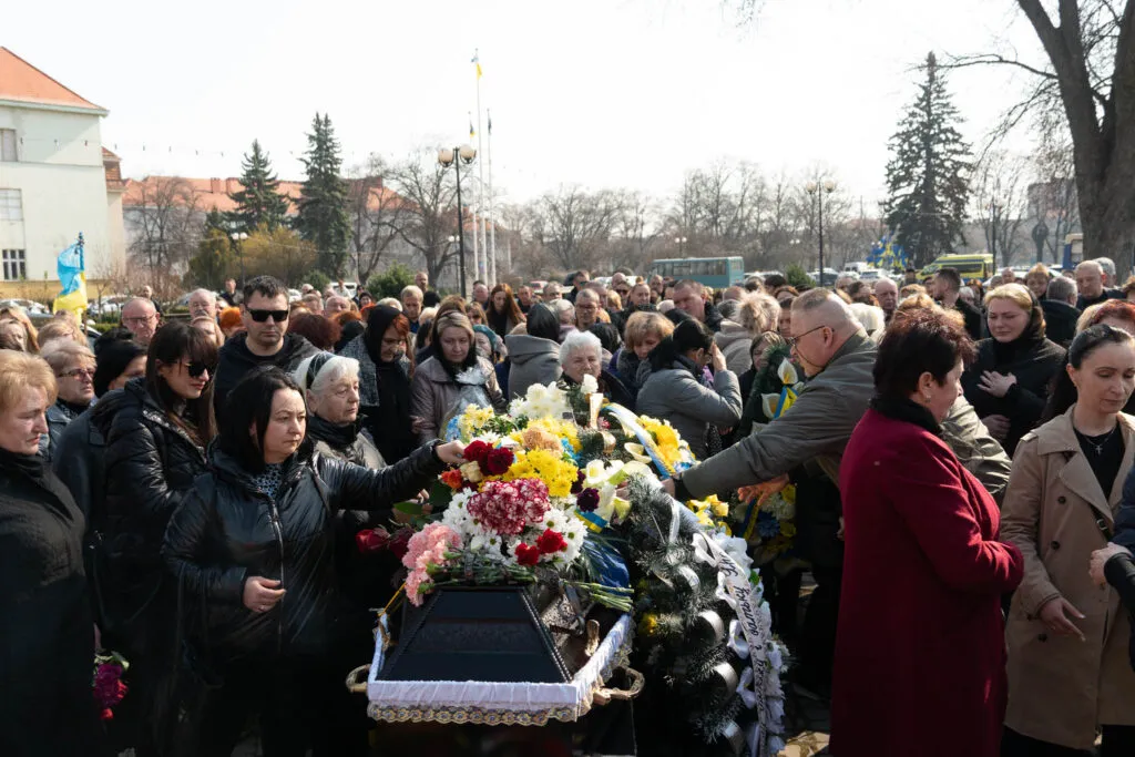 Прощалися із захисником на площі Народній. Віддати шану полеглому воїну прийшли рідні, друзі, побратими, міський голова Богдан Андріїв, ужгородці й військовослужбовці.