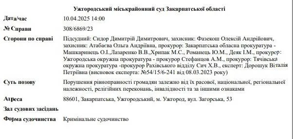 Як раніше повідомлялось, сепаратисту Димитрію Сидору в Ужгороді повідомили про підозру за ч. 1 ст. 161 Кримінального кодексу України (порушення рівноправності громадян залежно від їх расової, національної, регіональної належності, релігійних переконань, та за іншими ознаками).