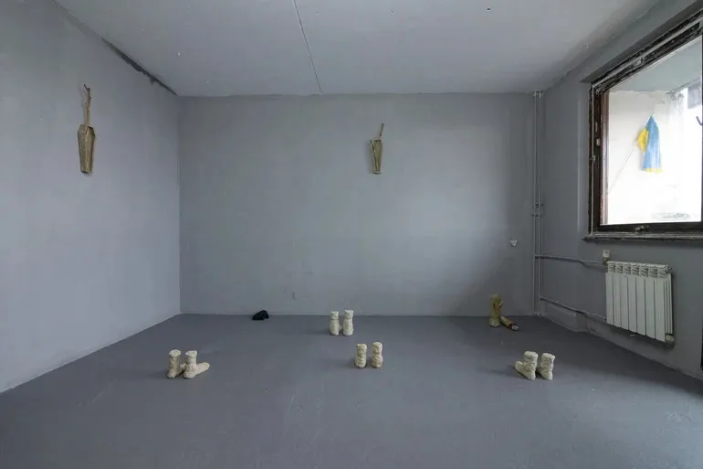 Поруч частково зібрані експонати, картки з назвами робіт, на стіні ще можна прочитати залишки одного з творів. “Павло Ковач тепер військовий. Працює з тілами загиблих воїнів. Фраза на стіні – про його запитання: як сповістити рідних про загибель військового?”, – пояснює Петро Ряска.