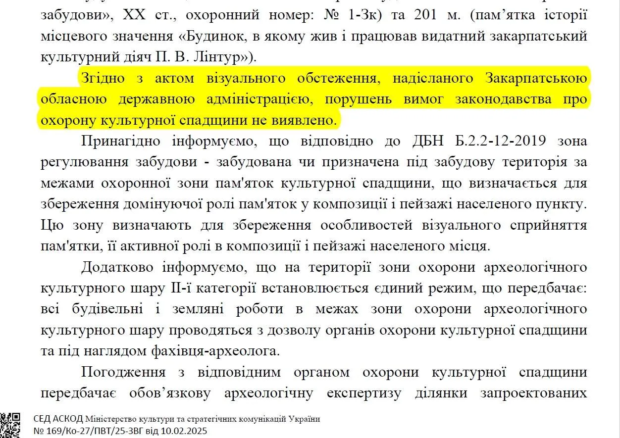 «У процесі розгляду поданих матеріалів встановлено невідповідність прийнятих архітектурних рішень вимогам НПД м. Ужгород, зокрема порушена масштабність та видові панорами міста», – зазначили в Міністерстві культури та стратегічних комунікацій України і додали, що у вересні 2024 року доручили Закарпатській ОВА періодично моніторити вказаний об’єкт та у випадку початку робіт невідкладно повідомити міністерство.