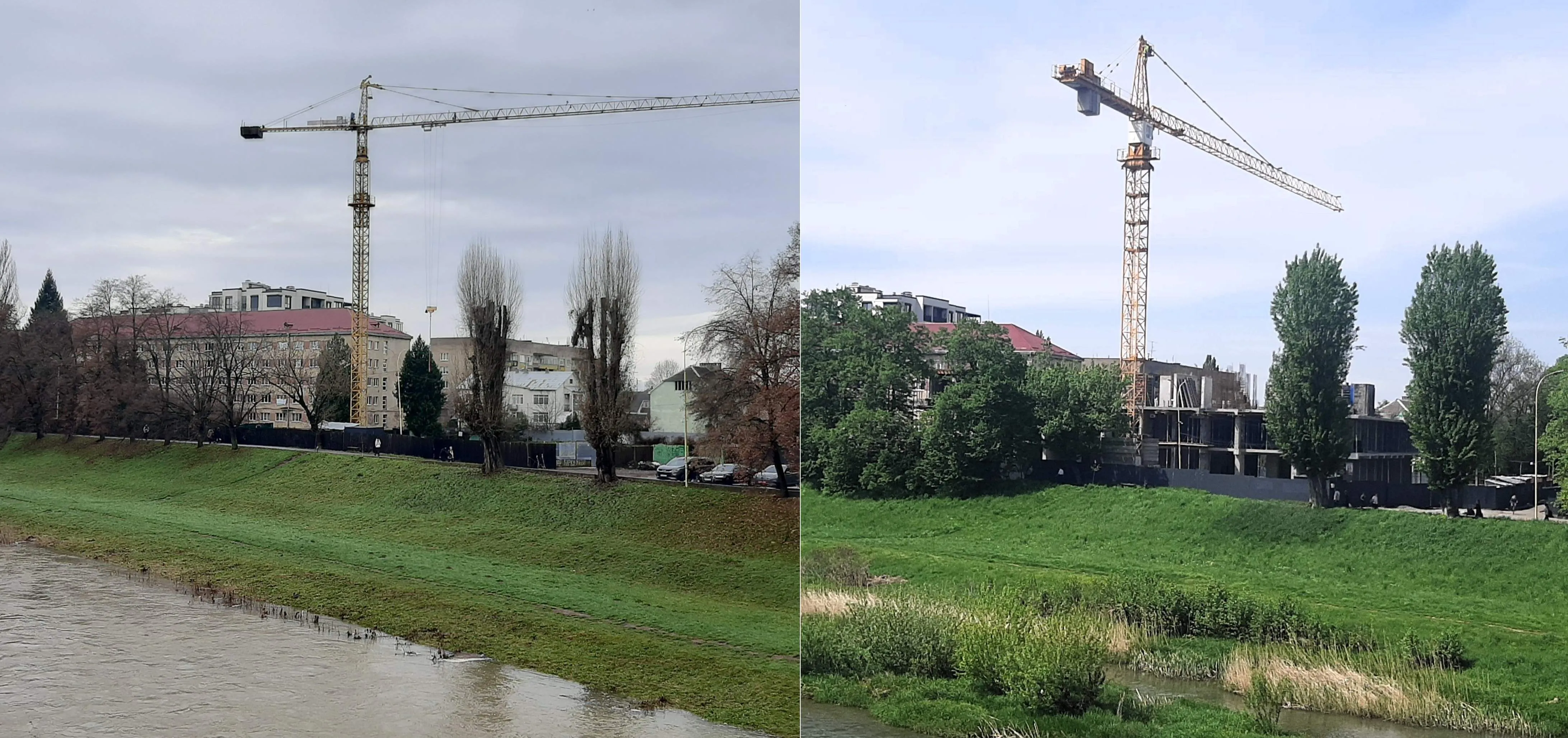 Як видно на світлинах, зроблених 14 грудня 2023 року та 24 квітня 2025 року, за цей період на Студентській набережній звели вже два поверхи майбутньої висотки.