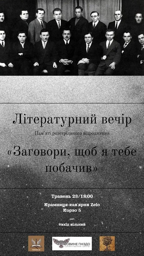 23 травня о 18:00 у середньовічній крамниці-кав’ярні Zelo (вул. Корзо, 5) відбудеться Літературний вечір пам’яті Розстріляного Відродження, організований творчим об’єднанням «Futurum».