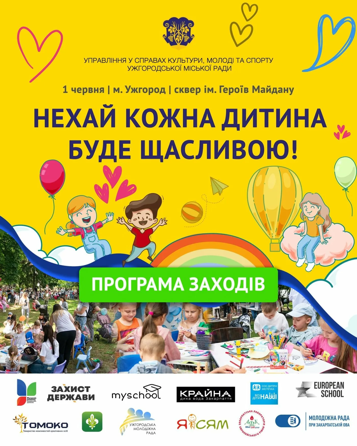 1 червня, в центрі Ужгорода (сквер ім. Героїв Майдану) з 12:00 розпочнеться святкова програма до Дня захисту дітей. На наймолодших ужгородців чекають інтерактивні локації, творчі осередки, веселі ігри, майстер-класи, аквагрим, аніматори, стрільба з лука, боулінг, подарунки, лотерея та інші розваги. Про це інформує Ужгородська міська рада у Фейсбуці.