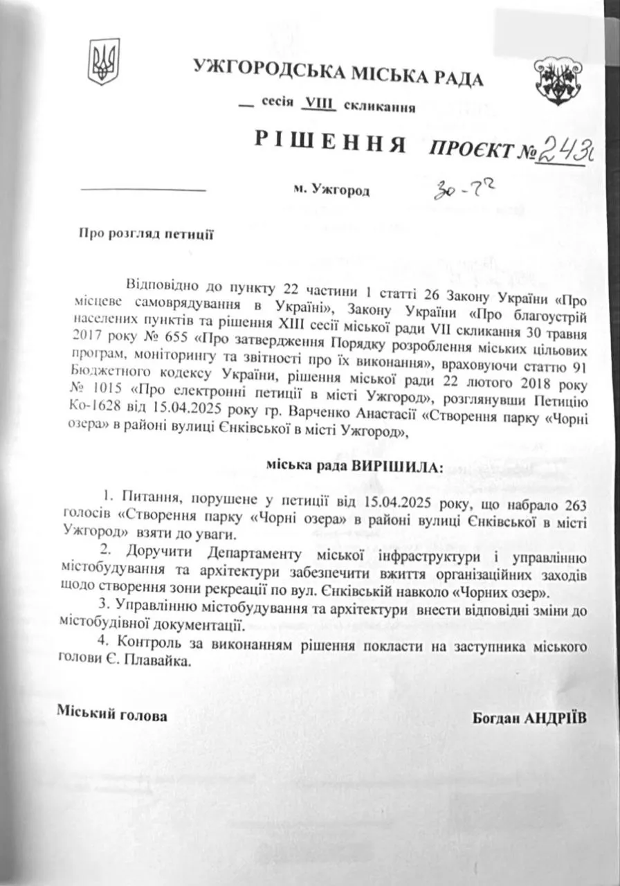 Щойно на сесії Ужгородської міської ради прийнято рішення про створення парку “Чорні озера” в районі вулиці Єнківської. Відповідне рішення «Про розгляд петиції» підтримали 22 депутати.