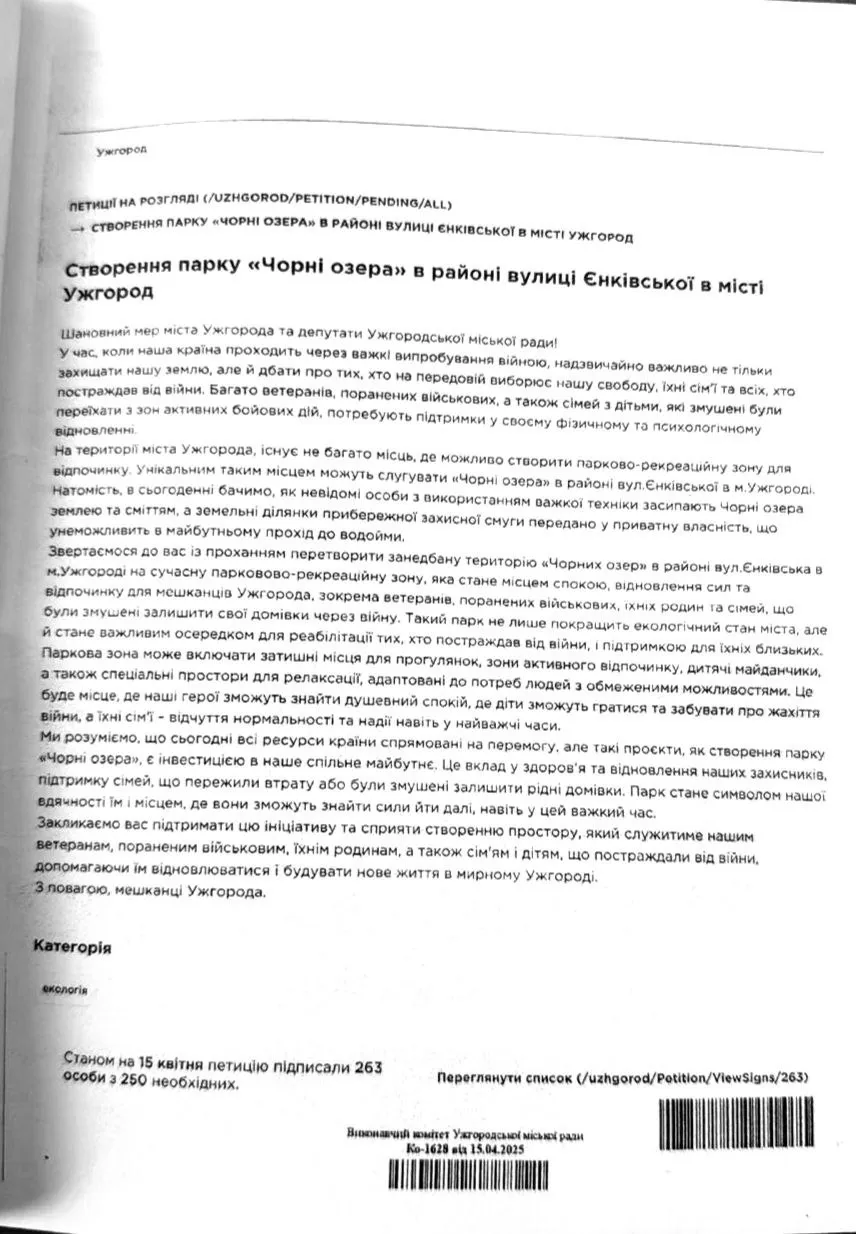 Як повідомлялось раніше, петиція про створення парку “Чорні озера” в Ужгороді була створена 7 квітня і достроково назбирала необхідну кількість за 5 днів.