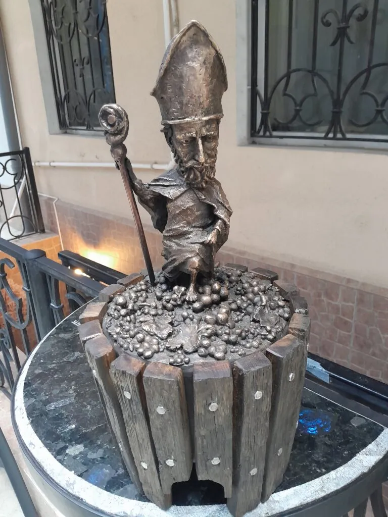 Забудьте про нудні пам’ятники, на які можна лише подивитися здалеку. Ця скульптура створена, щоб взаємодіяти з вами! Святий Урбан зображений у момент, коли він, делікатно підтримуючи сутану, ногами топче виноград у діжці. Але головна фішка прихована всередині: у діжці захована ємність із вином та дозатором! Так-так, ви все правильно зрозуміли – ви можете налити вино прямо з краника, вмонтованого в основу скульптури. Це ж геніально!