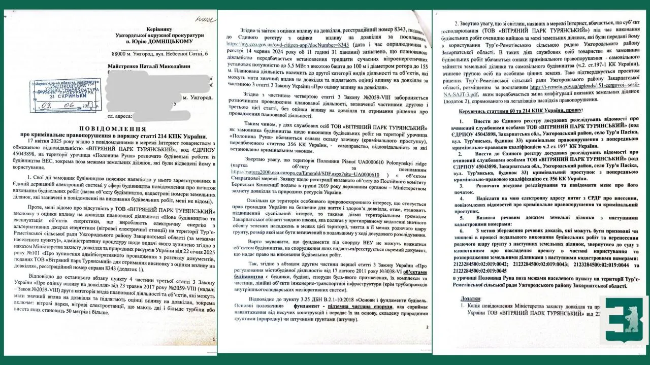 Як повідомлялось раніше, 9 червня, адвокатка Наталія Майстренко подала до керівника Ужгородської окружної прокуратури Ю.Домніцького повідомлення про кримінальне правопорушення за двома статтями Кримінального кодексу України (197-1 та 356 КК України), які вчинені службовими особами ТОВ «ВІТРЯНИЙ ПАРК ТУРЯНСЬКИЙ» на полонині Руна.