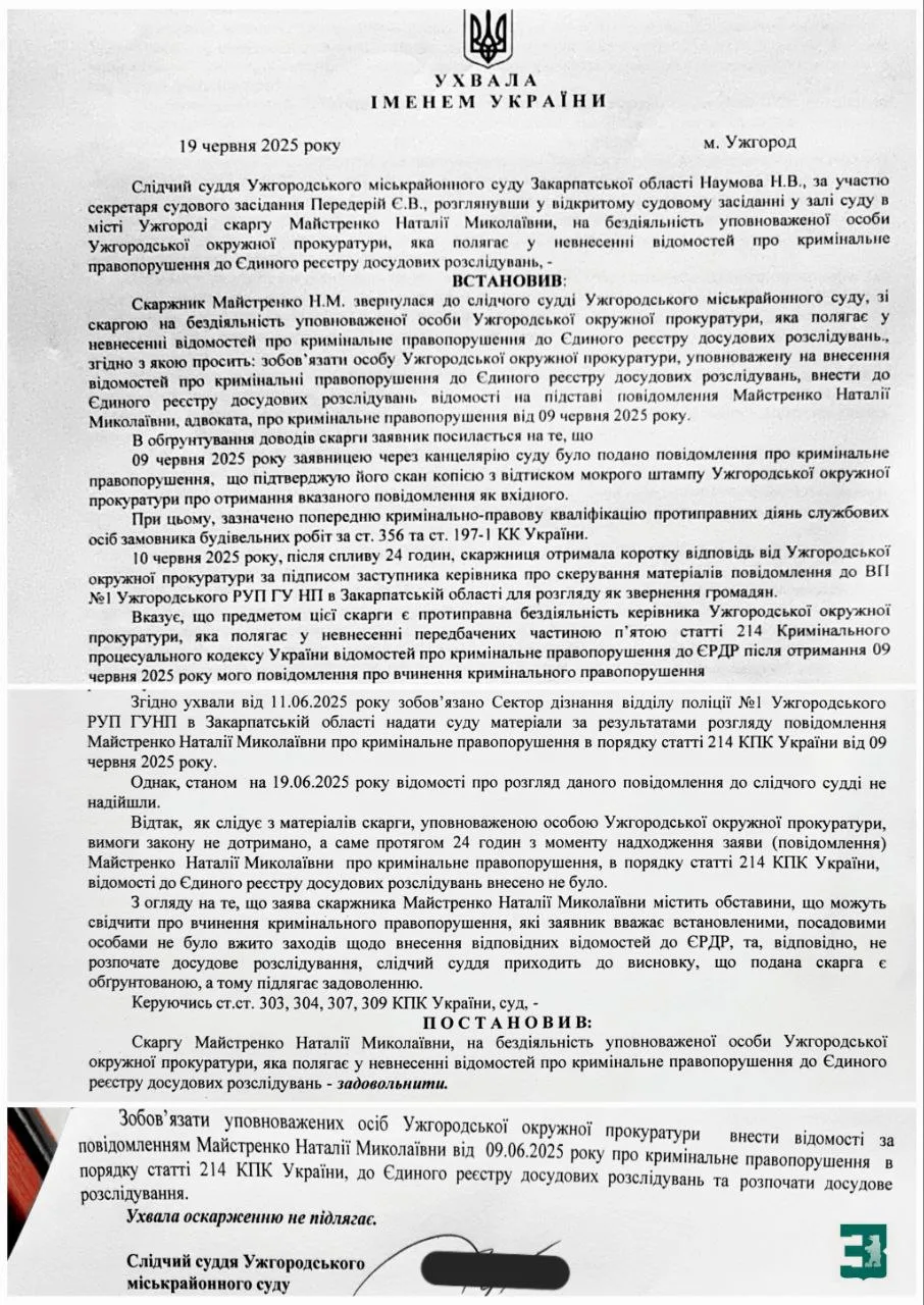 19 червня ухвалою слідчого судді Ужгородського міськрайонного суду Н.Наумової скаргу Наталії Майстренко на бездіяльність прокуратури було задоволено та зобов’язано уповноважених осіб Ужгородської окружної прокуратури внести відомості за її повідомленням від 09.06.2025 року про кримінальне правопорушення в порядку статті 214 КПК України, до Єдиного реєстру досудових розслідувань та розпочати досудове розслідування.