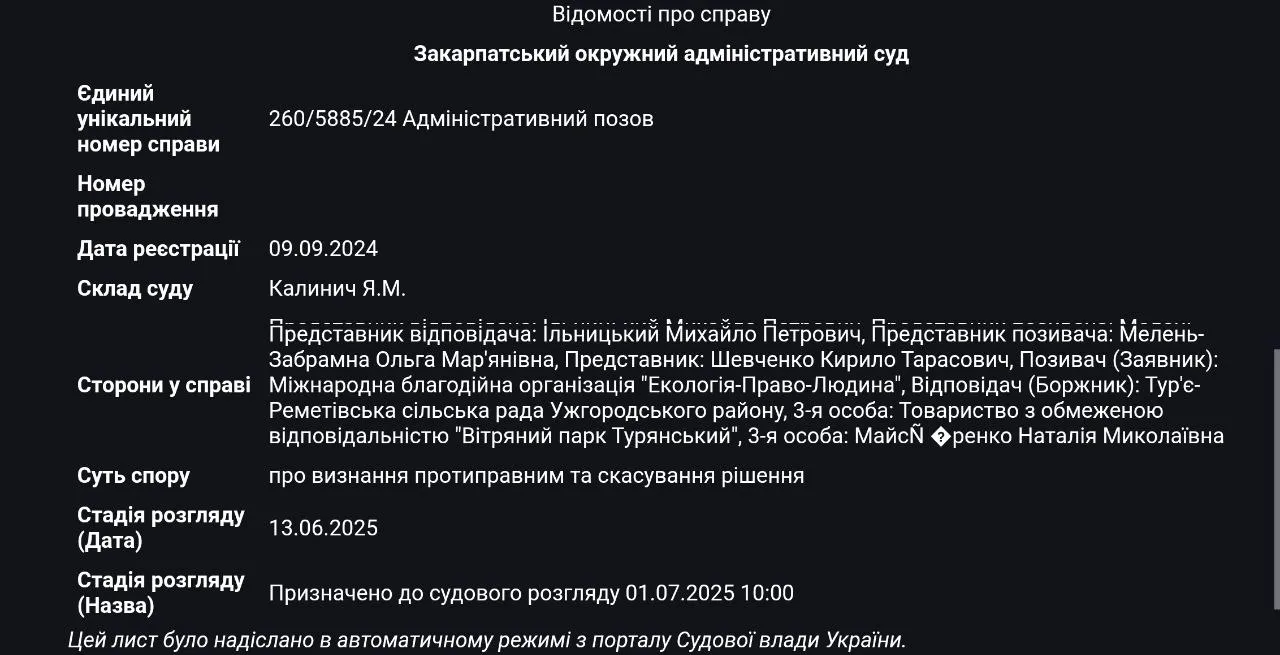 Сьогодні, 1 липня, об 10:00, в Закарпатському окружному адміністративному суді під головуванням голови суду Ярослави Калинич  відбудеться  засідання у справі №260/5885/24 за позовом Міжнародної благодійної організації «Екологія-Право-Людина» (ЕПЛ) до Тур’є-Реметівської сільської ради щодо визнання протиправним та скасування рішення Тур’є-Реметівської сільської ради № 1242 від 23 травня 2024 року «Про затвердження детального плану території ур. «Полонина Руна», яким передбачено будівництво 30 вітряків на полонині Руна.