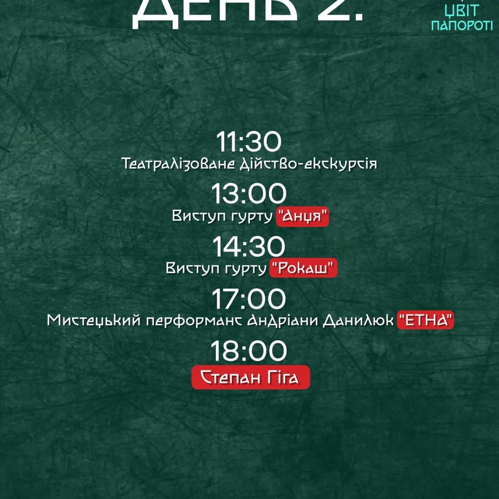- Театралізована екскурсія, виступи гуртів «Анця», «Рокаш», мистецький перформанс Андріани Данилюк «ЕТНА» та концерт Степана Гіги