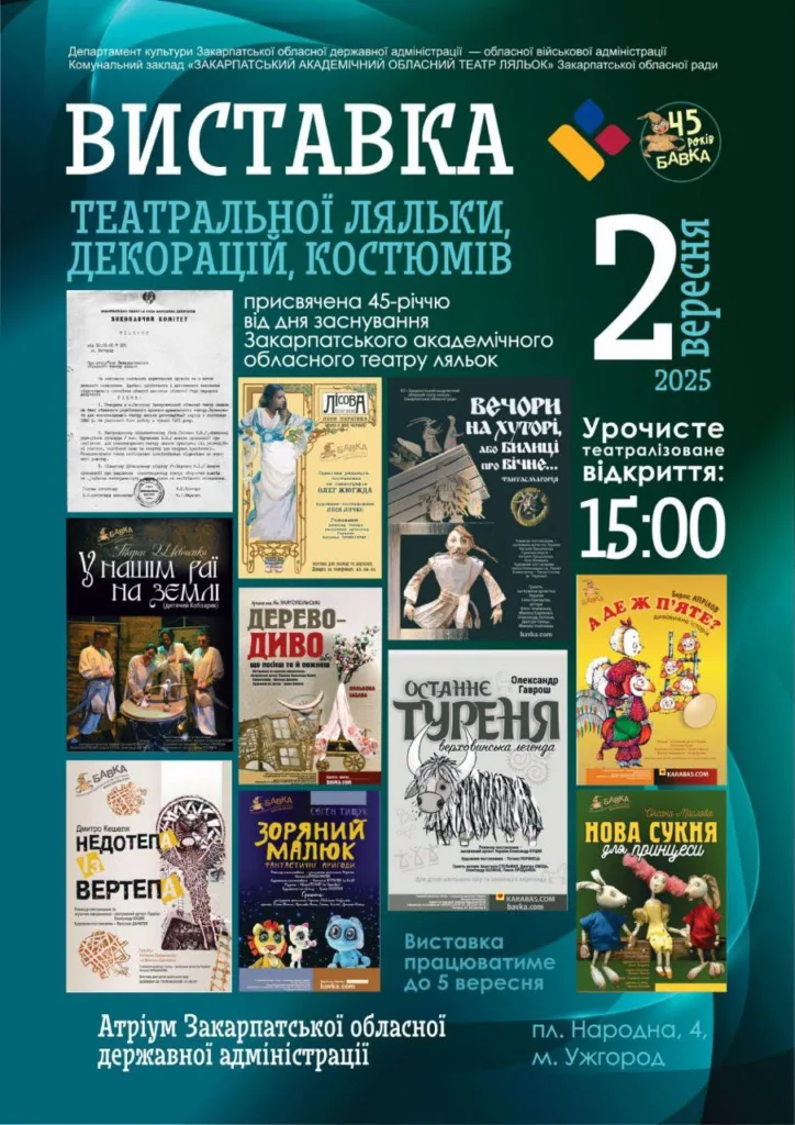 Однією з перших мистецьких ініціатив стане виставка театральних ляльок, декорацій і костюмів, яка відкриється вже у вівторок, 2 вересня, в атріумі будівлі Закарпатської обласної державної адміністрації.