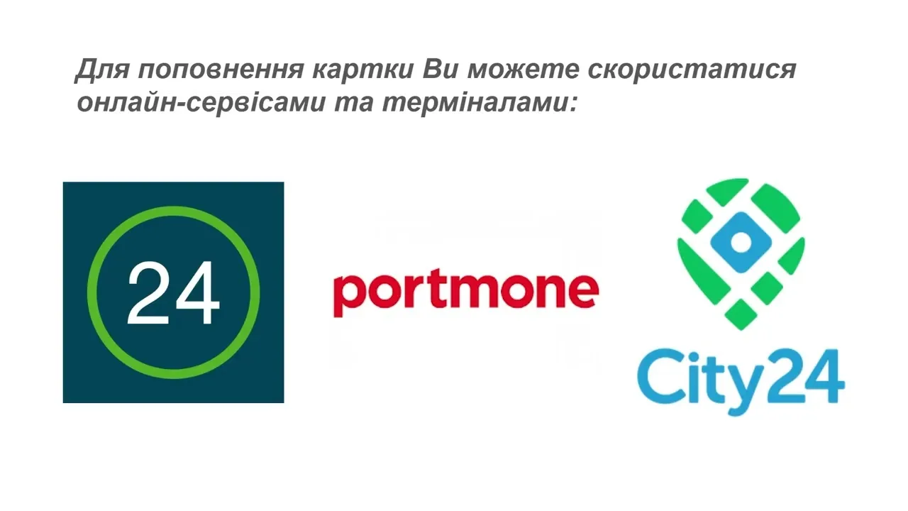 Поповнити рахунок можна через сервіси та термінали: Приват24, Portmone, City24.