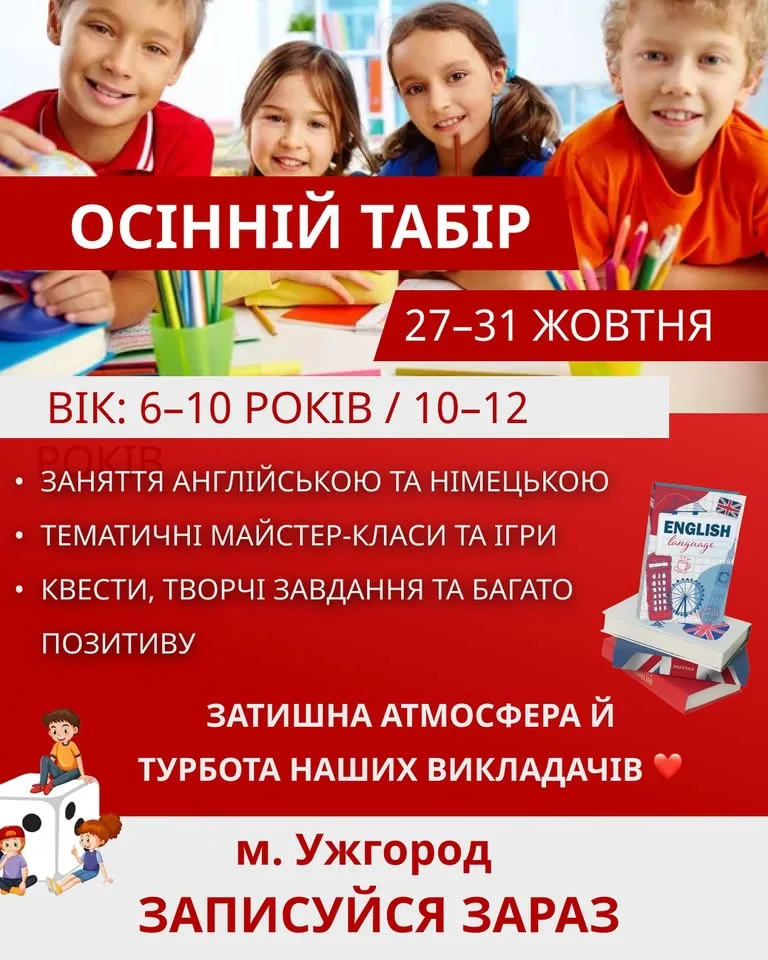 Мовна школа “Крок” запрошує школярів 6-10 та 10-12 років на денний табір на канікули, де діти не просто відпочивають — вони говорять, творять і навчаються. У програмі: заняття англійською та німецькою в інтерактивному форматі, тематичні майстер-класи та ігри, квести, творчі завдання та багато позитиву.