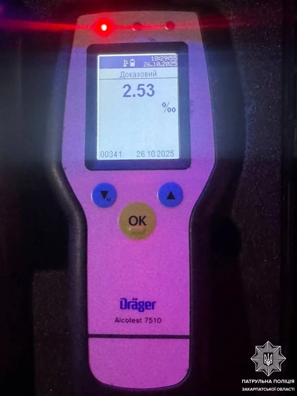 Під час спілкування з винуватцем поліцейські помітили ознаки алкогольного сп’яніння та запропонували пройти огляд за допомогою драгера. Результат — 2,53‰ алкоголю в крові.
