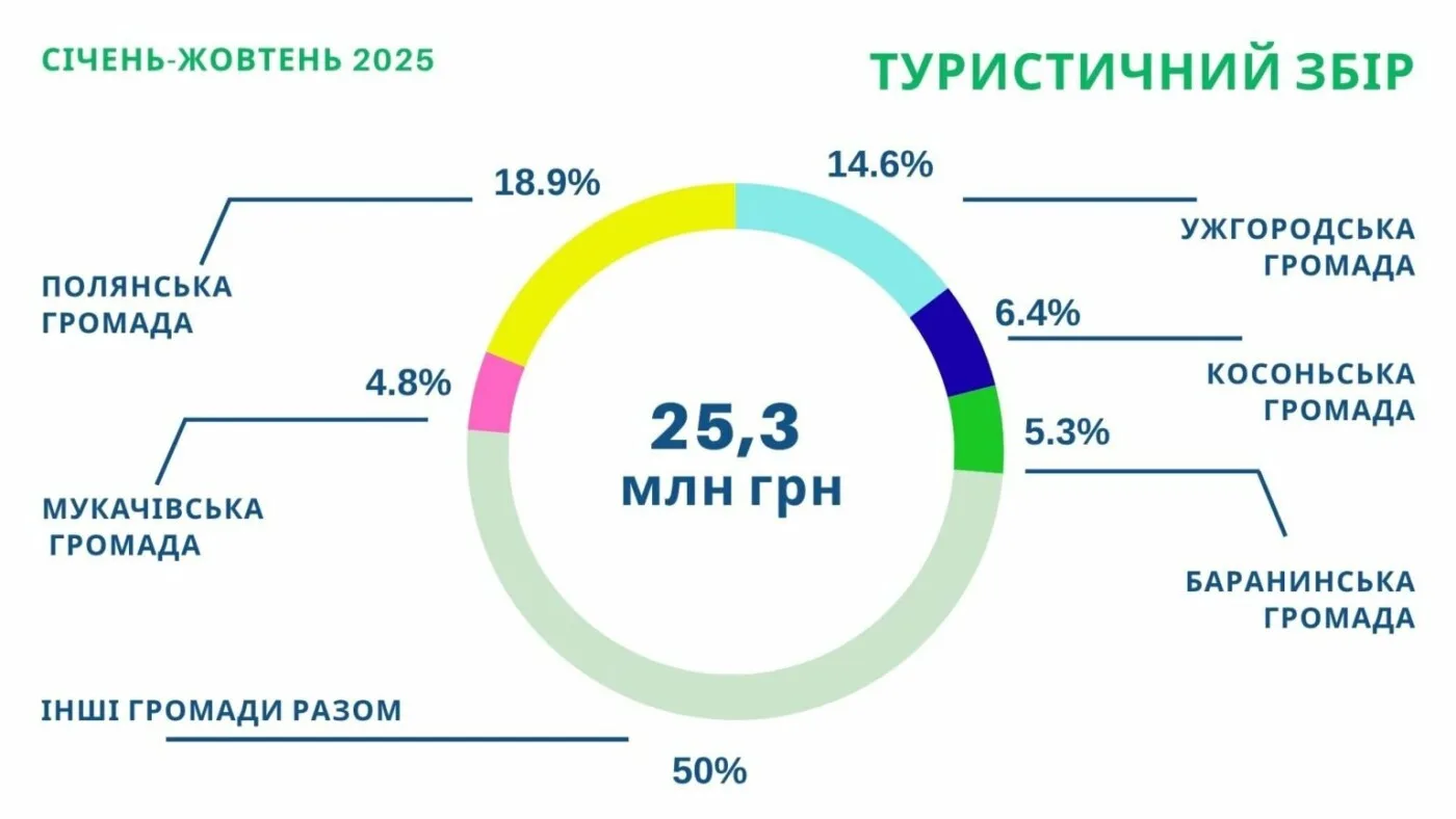 Упродовж січня-жовтня 2025 року до місцевих бюджетів Закарпатської області сплачено 25 млн 385 тис. грн туристичного збору, що на 40 % більше аналогічного періоду 2024 року. Про це інформує Управління туризму та курортів Закарпатської ОВА у Фейсбуці.