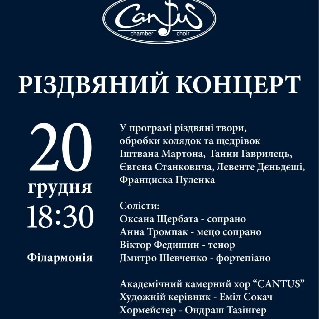 Камерний хор «Кантус» запрошує ужгородців та гостей міста на традиційний різдвяний концерт, що наповнить серця теплом та передсвятковим настроєм.