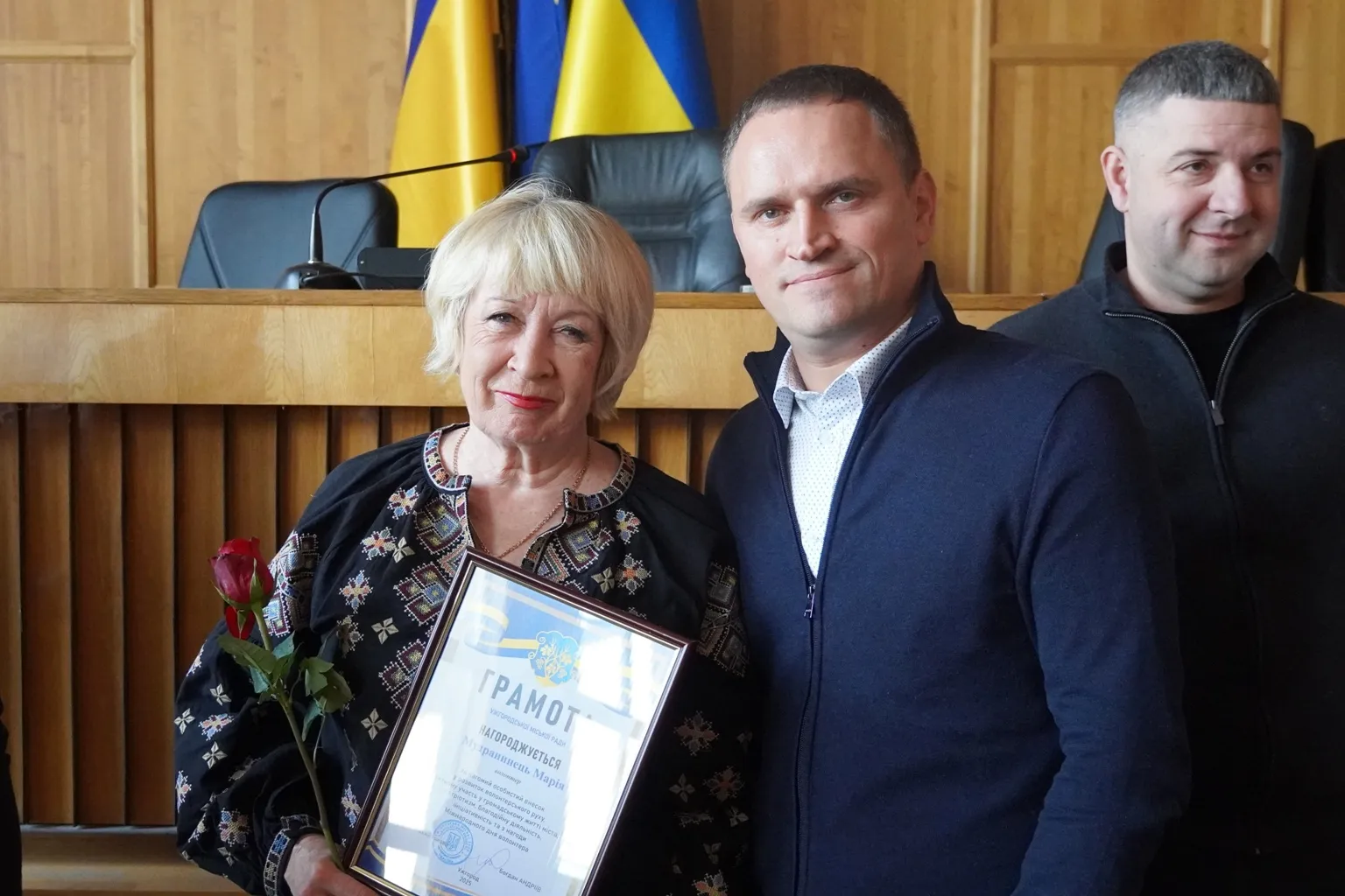 Слова вдячності від громади міста – за підтримку наших захисників, за допомогу переселенцям, соціально вразливим ужгородцям, за участь у численних благодійних ініціативах висловили і секретар міської ради Ігор Чорній, заступники міського голови Іван Завидняк, Михайло Маргіта, керуючий справами виконкому міської ради Василь Пинзеник.