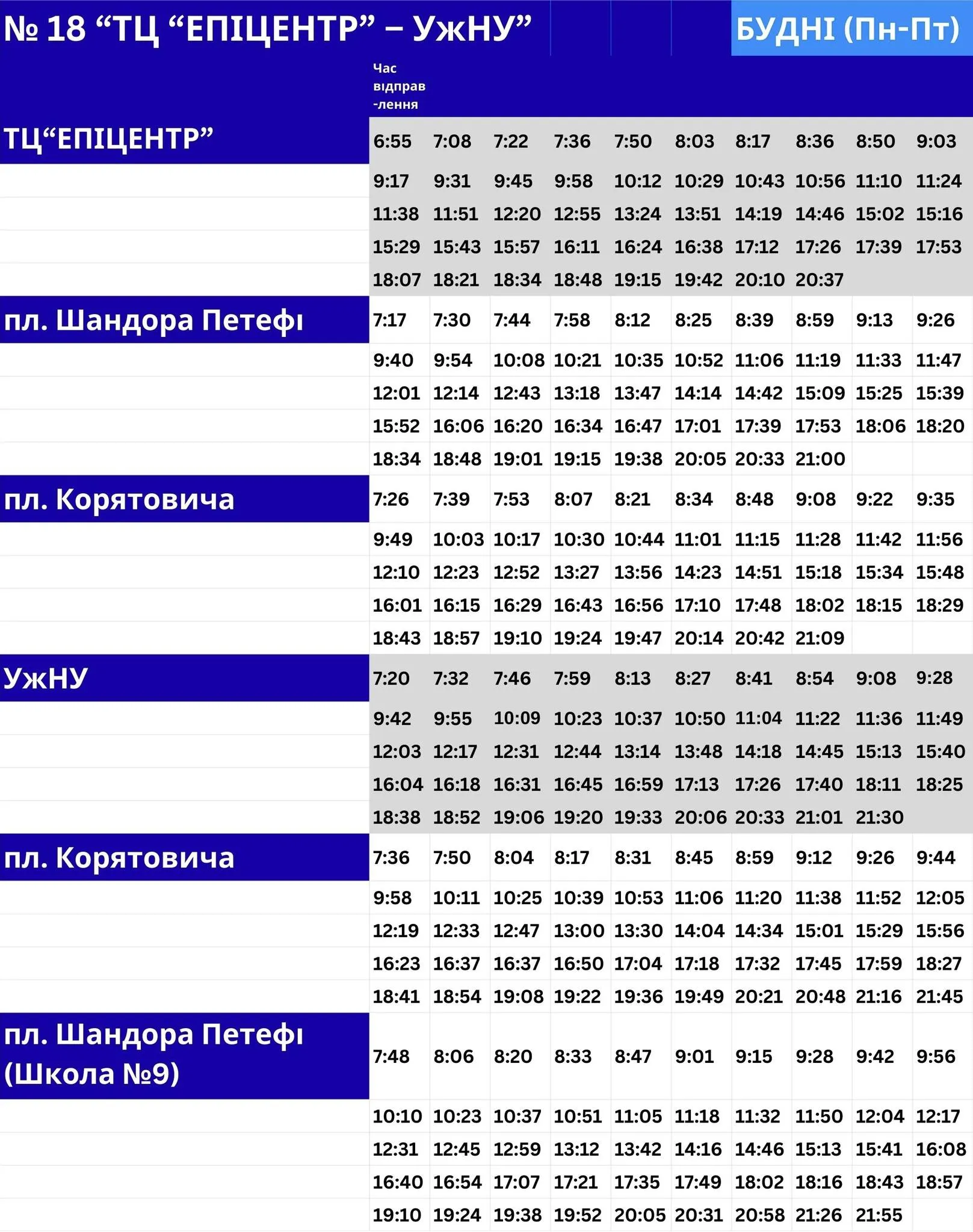 Анонси Місто 08.12.2025, 06:45 👁 24 Комунальне Підприємство “Ужгородський муніципальний транспорт” надає актуальний графік руху міського автобуса за маршрутом №18 у будні Вас може зацікавити:У неділю в Ужгороді — щорічний фестиваль «Коляди в старому селі»До уваги ужгородців! Формується список присяжних Ужгородського міськрайонного суду Поділитися: Facebook Telegram Viber