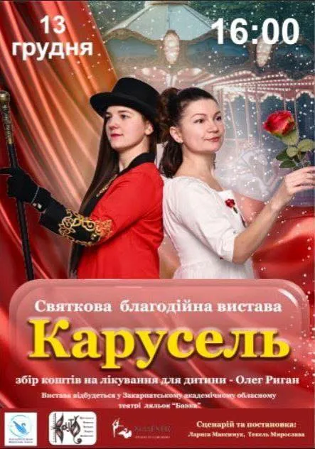 Сьогодні, 13 грудня, в Ужгороді відбудеться благодійний показ святкової музичної вистави «Карусель» від Театральної студії «КРУТО» та Школи танцю «Majestic». Захід організовують на підтримку 7-річного закарпатця Олега Ригана, який бореться з важким генетичним захворюванням.