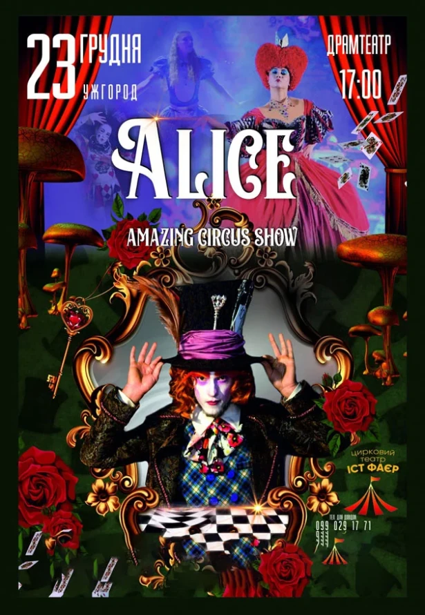 У Закарпатський музично-драматичний театр запрошують малечу з батьками на циркове шоу. Історія подорожі Аліси в світ чарівництва і дивовижностей оживе у вирі чудернацьких подій. На шоу, в якому гармонійно поєднуються несподівані візуальні ефекти, трюки на унікальному цирковому реквізиті запрошують до муздрамтеатру.