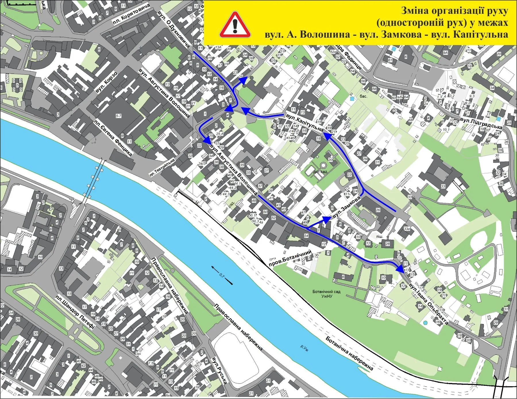 Увага! В історичній частині Ужгорода змінюється схема автомобільного руху. Як повідомляє департамент міської інфраструктури міськради, з вечора 27 грудня на вулицях Капітульній та Замковій запроваджується односторонній рух.