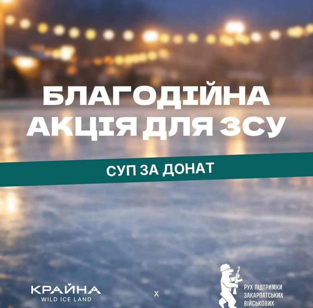 Цими вихідними в Ужгороді з’явиться чудова нагода поєднати зимові розваги з благодійністю. Ковзанка Krayna IceLand спільно з «Рухом підтримки закарпатських військових» організовує акцію на допомогу Збройним Силам України. На відвідувачів чекає не лише драйвове катання, а й гарячий суп, за який кожен зможе задонатити на добру справу.