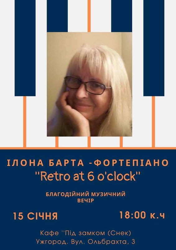 На Благодійний музичний вечір Ілони Барти «Retro at 6 o`clock» запрошують поціновувчів музики. В кафе-музеї «Під замком», в історично цінних стінах лунатимуть мелодії і ритми з різних країн та часів. «Ви проживете цей вечір у вирі чуттєвих ностальгічних пристрастей», — обіцяють організатори.