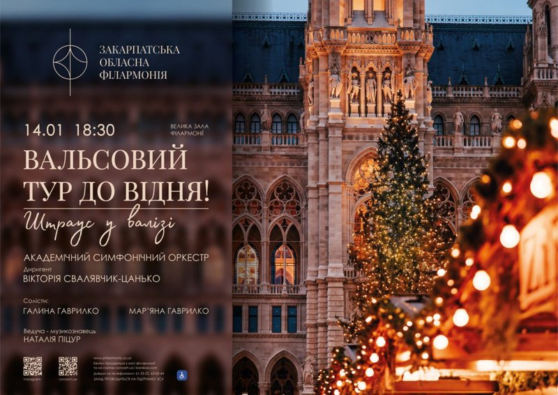 Закарпатський народний хор вдруге покаже Великий різдвяний концерт, а Академічний симфонічний оркестр — зіграє концерт «Вальсовий тур до Відня. Штраус у валізі». В обласній бібліотеці презентують «Календар краєзнавчих пам’ятних дат Закарпаття на 2026 рік», а в «Книгарні Є» — феміністичний детектив «Пані Арета і цвинтар молодиці». У скансен відбудеться кураторська екскурсія, а на Малій сцені драмтеатру покажуть 2 вистави.