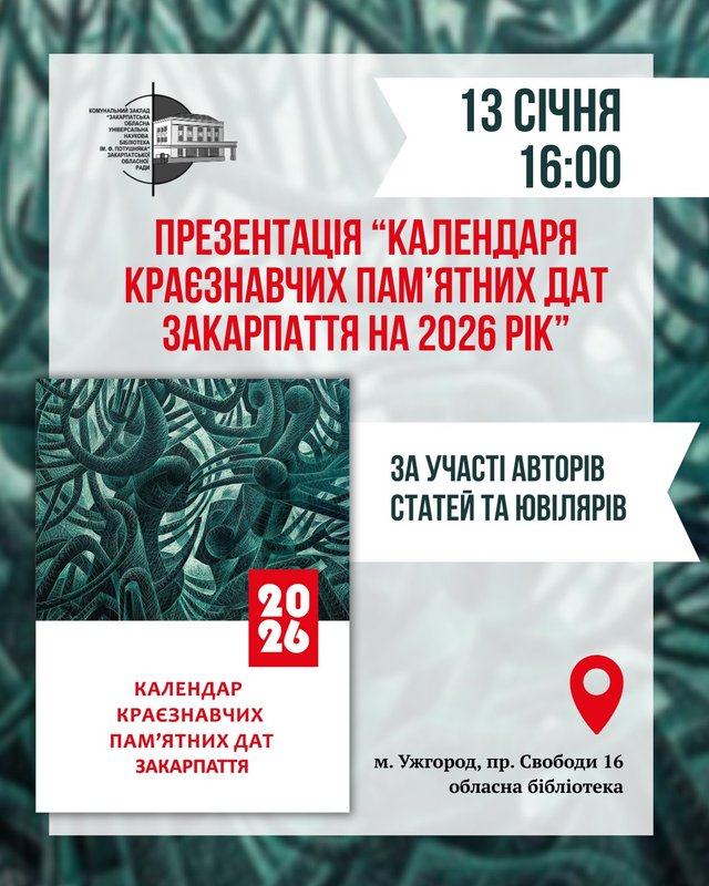 У Закарпатській обласній бібліотеці ім. Ф. Потушняка презентують традиційний щорічник «Календар краєзнавчих пам’ятних дат Закарпаття на 2026 рік». Представлення відбудеться за участі укладачів, авторів статей та ювілярів і буде присвячене пам’яті професора Сергія Федаки.