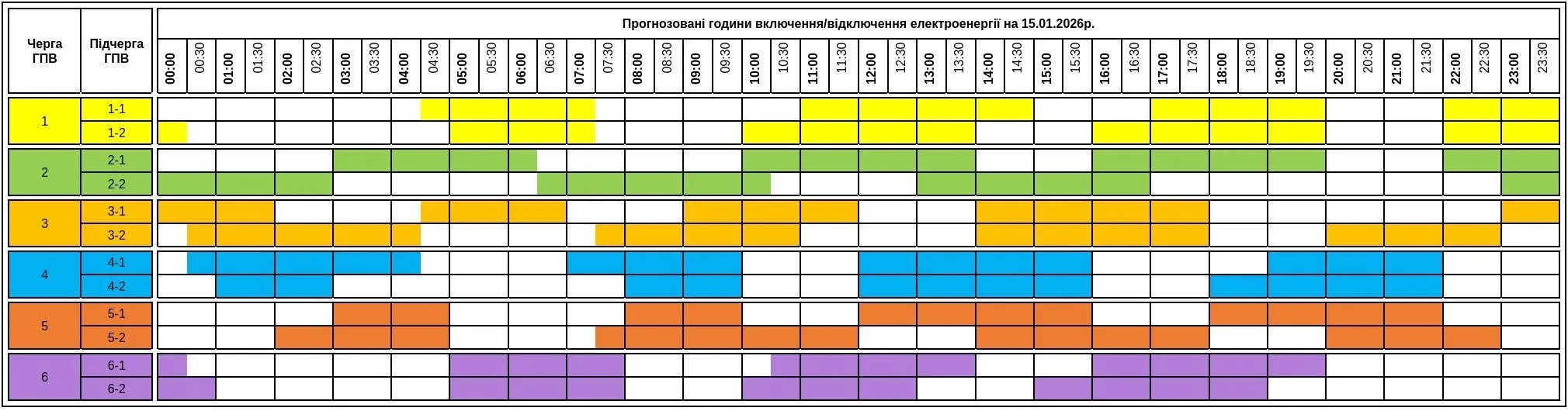 Згідно з актуальними даними, дефіцит потужності в загальнонаціональній мережі змушує енергетиків задіювати графіки погодинних відключень (ГПВ) упродовж усієї доби. Часові інтервали обмежень розподілені за шістьма основними чергами. Тривалість відсутності напруги безпосередньо залежить від поточного рівня споживання та стану енергетичного обладнання після попередніх ремонтних робіт.